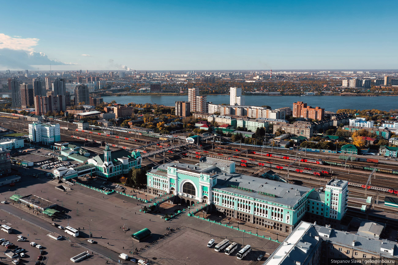 42. Ж/д вокзал «Новосибирск-главный». Современное здание вокзала построено в 1939 году, а общая длина всех путей на станции — около 100 км.