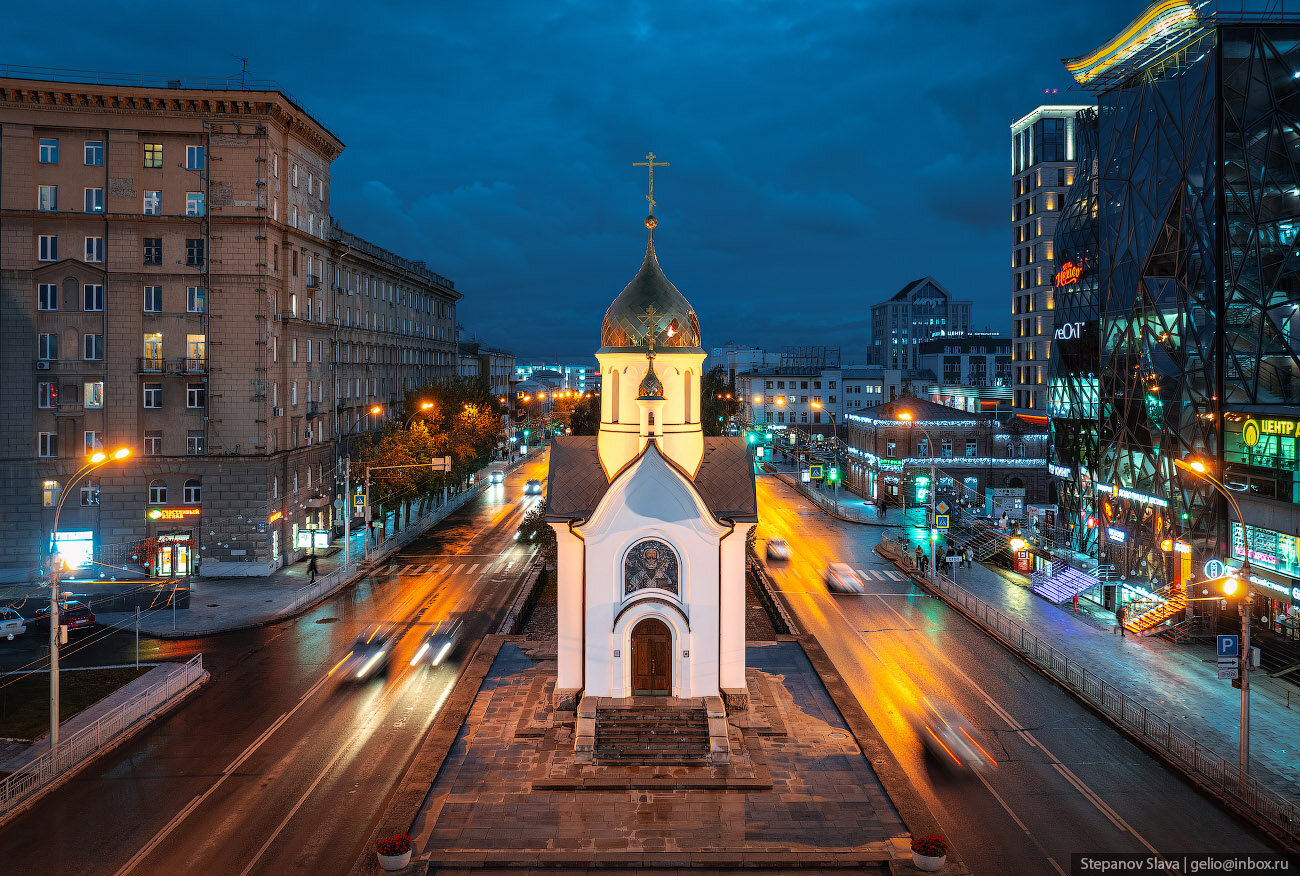 9. Часовня Николая Чудотворца на Красном проспекте. Первую часовню построили в 1914 году, а в 1930 году здание снесли. Позже на этом месте стояла статуя «Комсомолец», затем памятник Сталину. А в 1993 году, к столетнему юбилею Новосибирска, часовню восстановили.