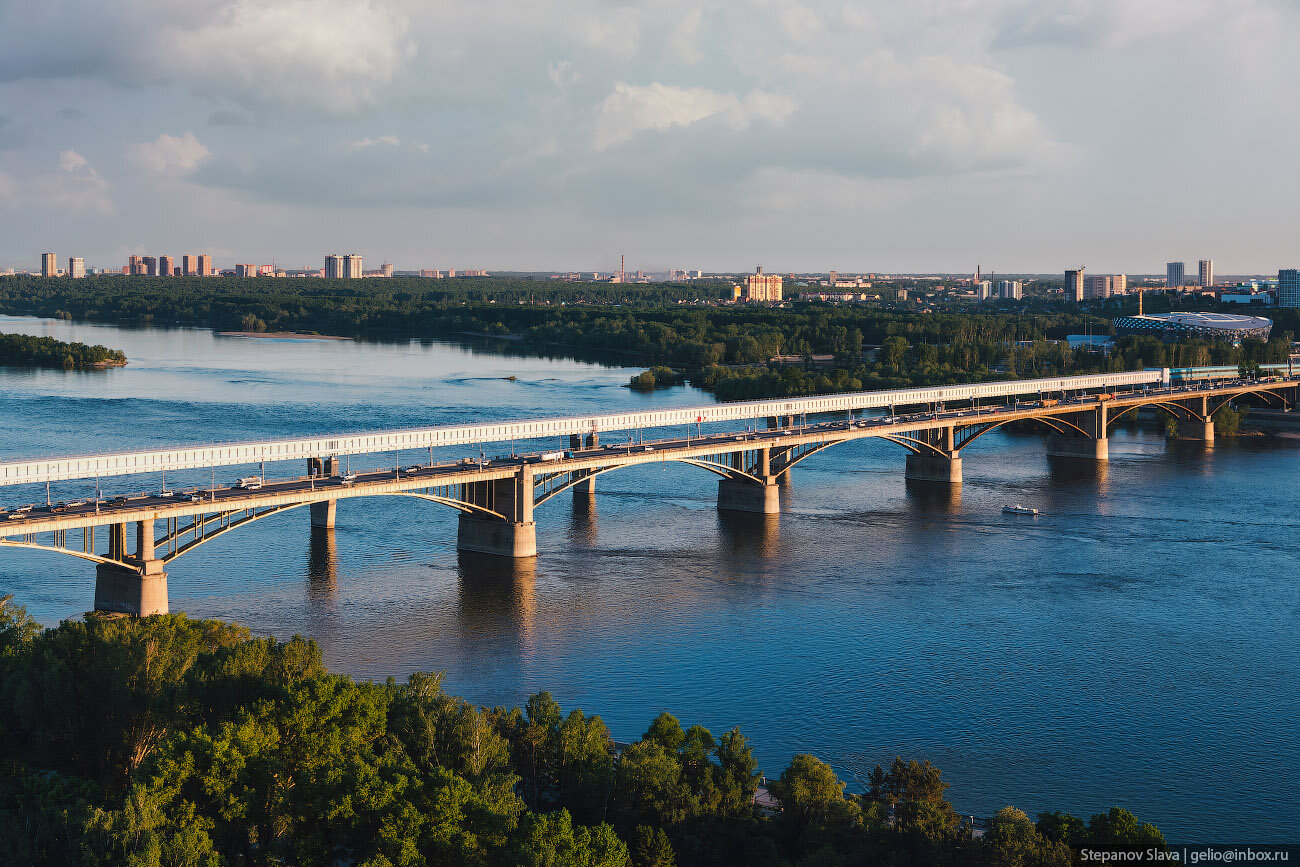 25. Октябрьский (Коммунальный) мост и метромост. Коммунальный мост был первым постоянным автомобильным мостом через Обь. Именно под этим мостом в 1965 году в метре от воды пролетел на самолёте МиГ-17 лётчик-ас Валентин Привалов. Такой пилотаж повторяют только в компьютерных играх — например, в GTA. Метромост в Новосибирске — самый длинный крытый метромост в мире. Его длина — более 2 км.