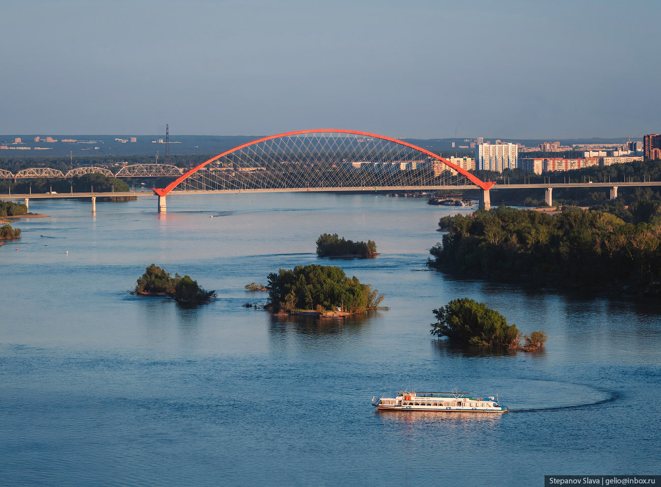 39. Железнодорожный, Центральный и Октябрьский мосты, метромост. Вдали — Бугринский и Комсомольский мосты. Ещё через 17 км — плотина Новосибирской ГЭС, за которой открывается Новосибирское водохранилище — Обское море.