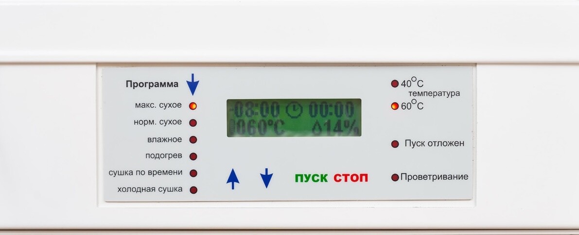 Электронный контроллер с датчиками температуры и влажности предлагает 6 программ («максимально сухое», «нормально сухое», «влажное», «подогрев», «холодная сушка», «проветривание»), таймер до 24 ч, отложенный пуск и точное поддержание 40 °C или 60 °C. На лицевой стороне крышки шкафа расположены органы управления с кнопками переключения режимов и световой индикацией, показывающим параметры сушки, режимы работы шкафа, а также коды возникающих ошибок. У модели HOTSTORM в схему управления электронного контроллера помимо датчика контроля температуры встроен датчик контроля влажности, обеспечивающий оптимальную работу встроенных шести программ.
