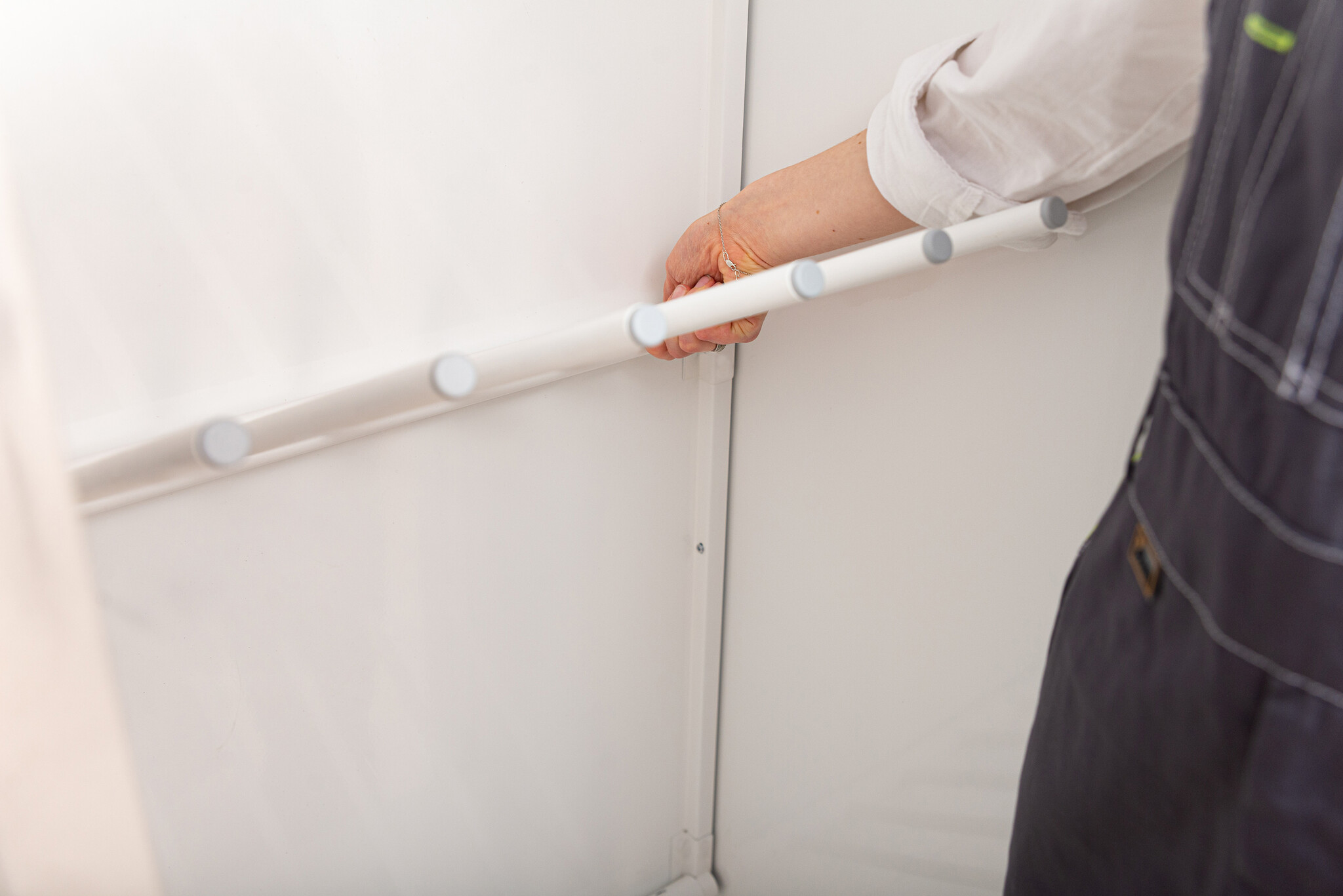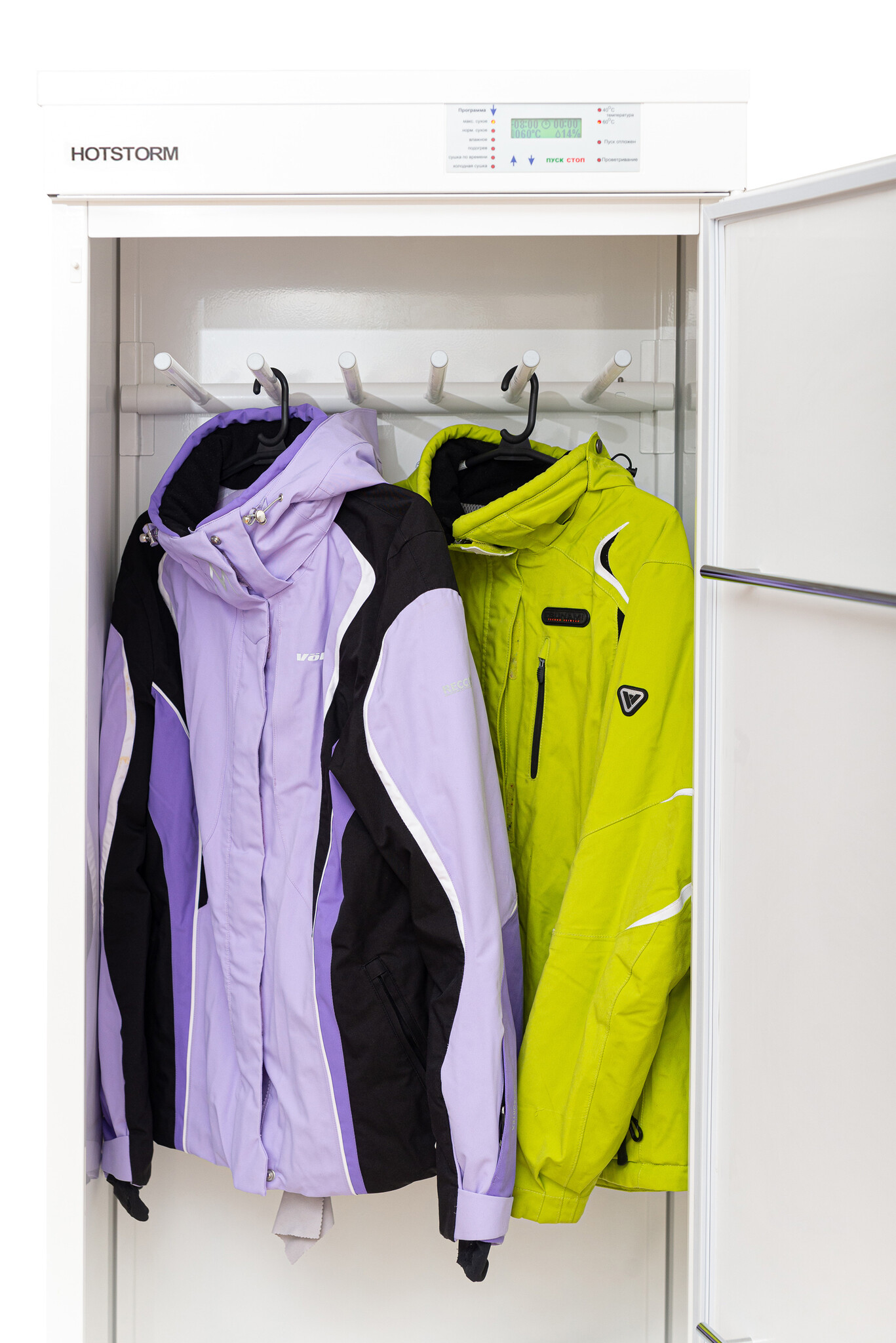 Нагревательный блок располагается внизу шкафа, что позволяет равномерно просушить все необходимые предметы гардероба. В качестве защиты от перегрева используется термоплавкий предохранитель (без возврата в исходное положение). В крышке шкафа расположено отверстие для выхода воздуха, а в комплекте прилагается фланец — при желании шкаф можно подключить к внешней системе вентиляции. Уровень шума сушильного шкафа HOTSTORM не превышает 55 дБ, а габариты 1805×600×520 мм и вес 59,4 кг позволяют использовать шкаф дома или на объектах с пониженным напряжением.